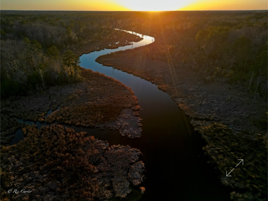 One of our oldest attempts to create a vacation community on the Southside of the Pamlico was Crystal Beach. It lies at the mouth of Nevil Creek. I got by there around sunset last week. It’s an interesting and beautiful place. Forty years ago, we’d frequently take my skiff up the creek fishing and sightseeing. Here you can get the view of the rich wetlands along the creek thanks to Skeeter the Drone.
