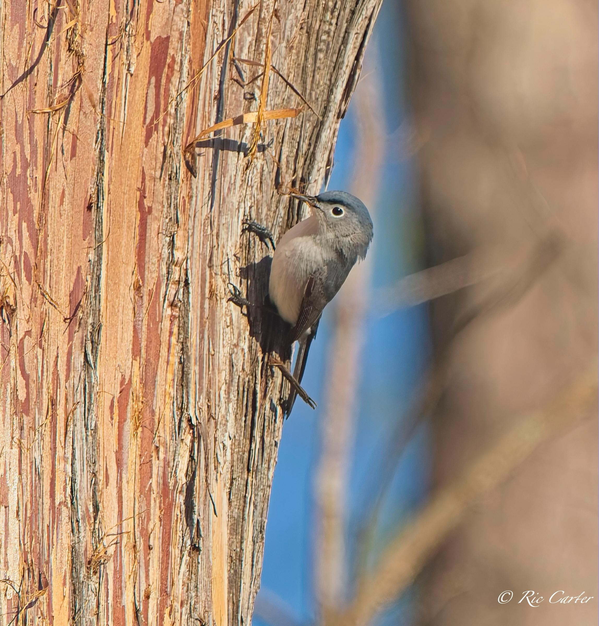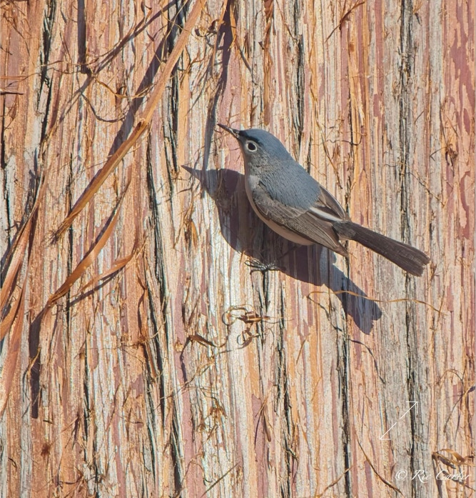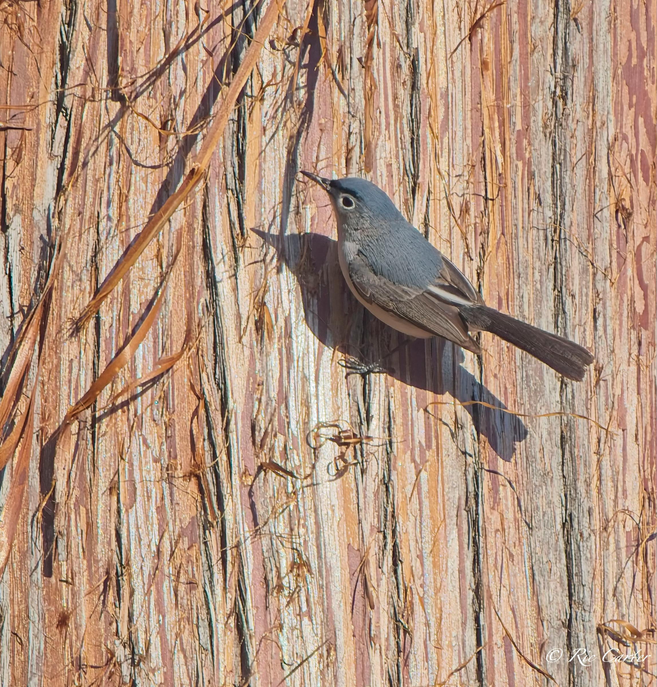 I had a lovely time one afternoon last week on the pier at the house. Looking at a nearby tree, I noticed a Blue Gray Gnatcatcher working around on the trunk. I thought at first it was bugging for lunch. After watching for a little, I realized that it was peeling bits of the stringy bark of the Cyress. Nest building season is hectic!