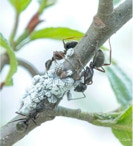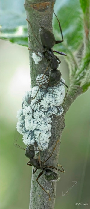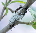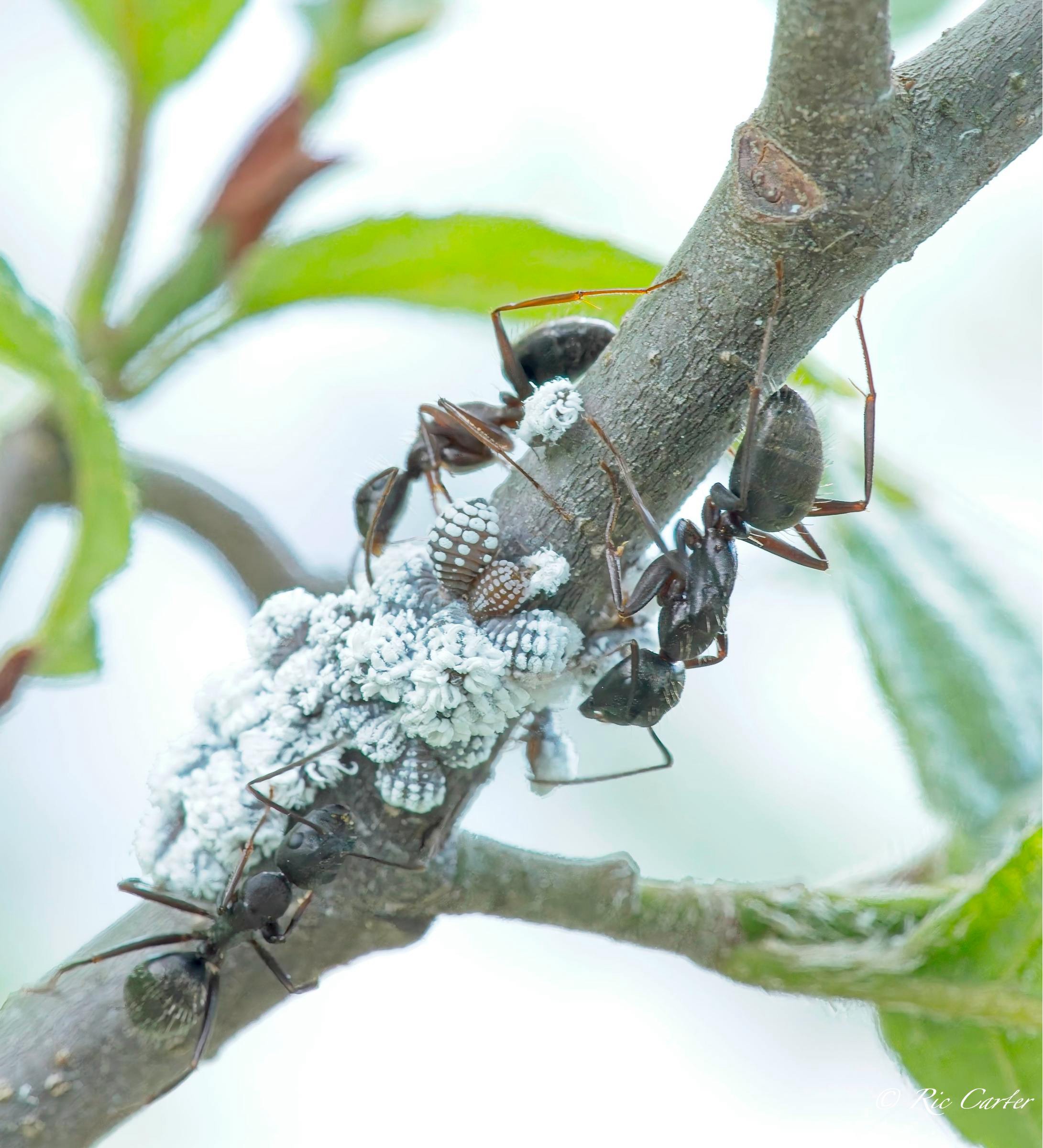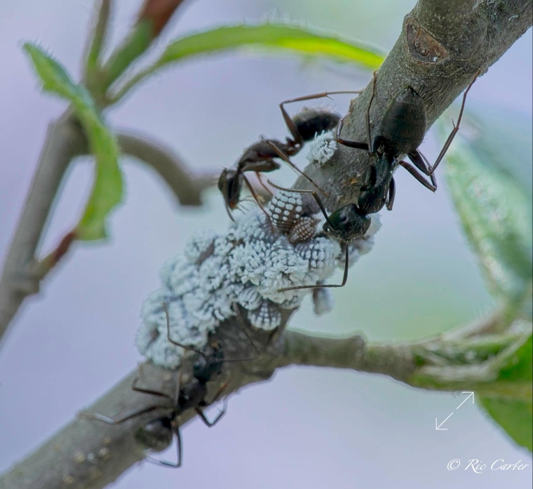 Every year we have these ants run an Aphid ranch on the branches of this Alder in our front yard. The ants tend the aphids and gather the honeydew they exude for feeding their colony.