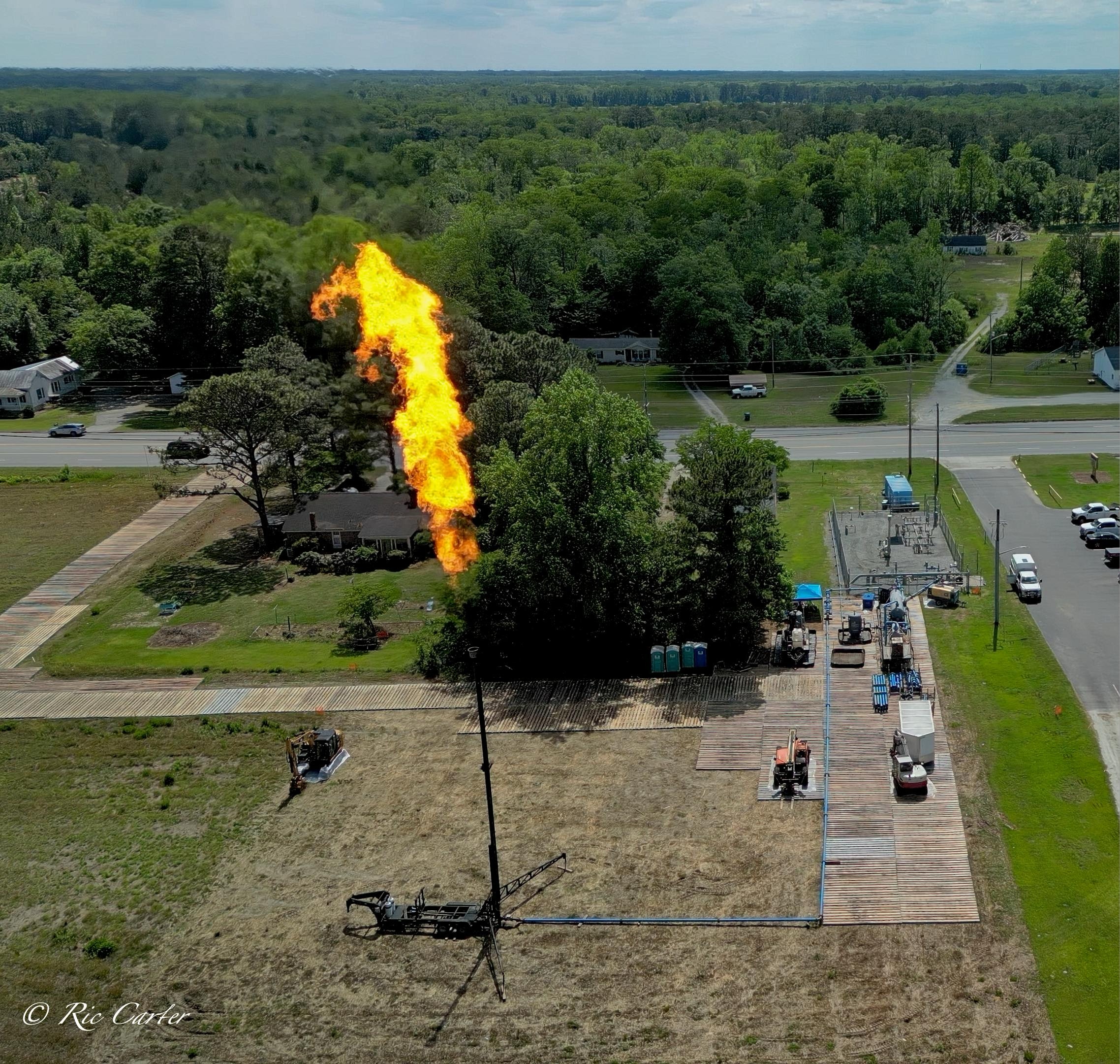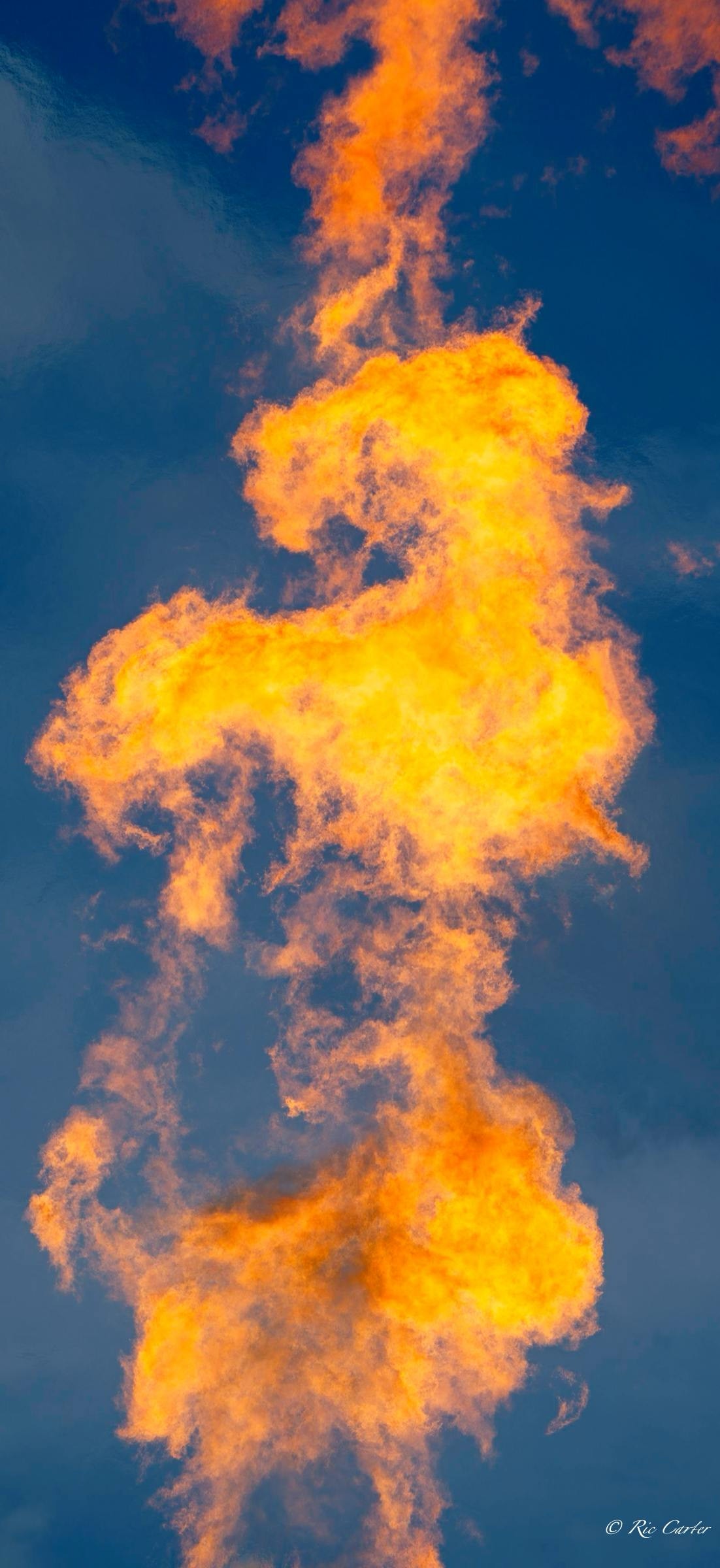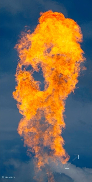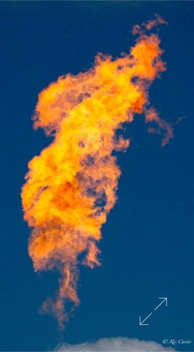 The gas company’s recent burn off of a pipeline set up a huge Bunsen burner that sounded like a jet as it flamed away. When frozen in place by a fast shutter, the flames furnish the same fodder for imagined pictures as star formations and clouds. What do you see?