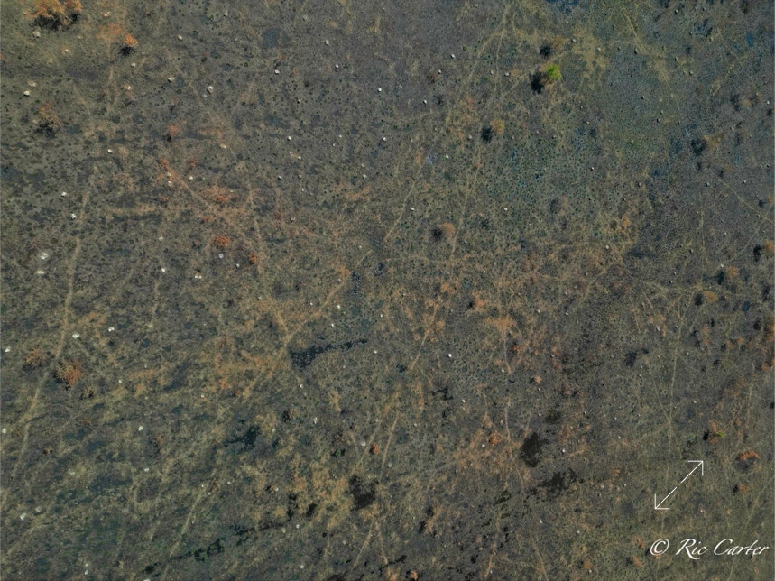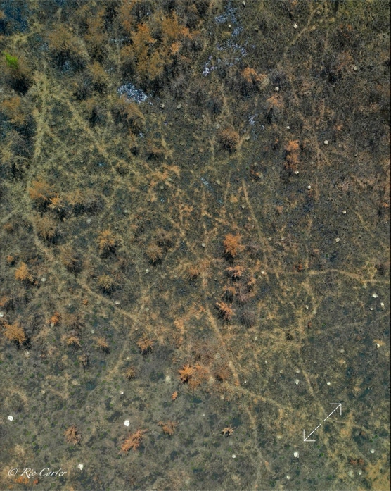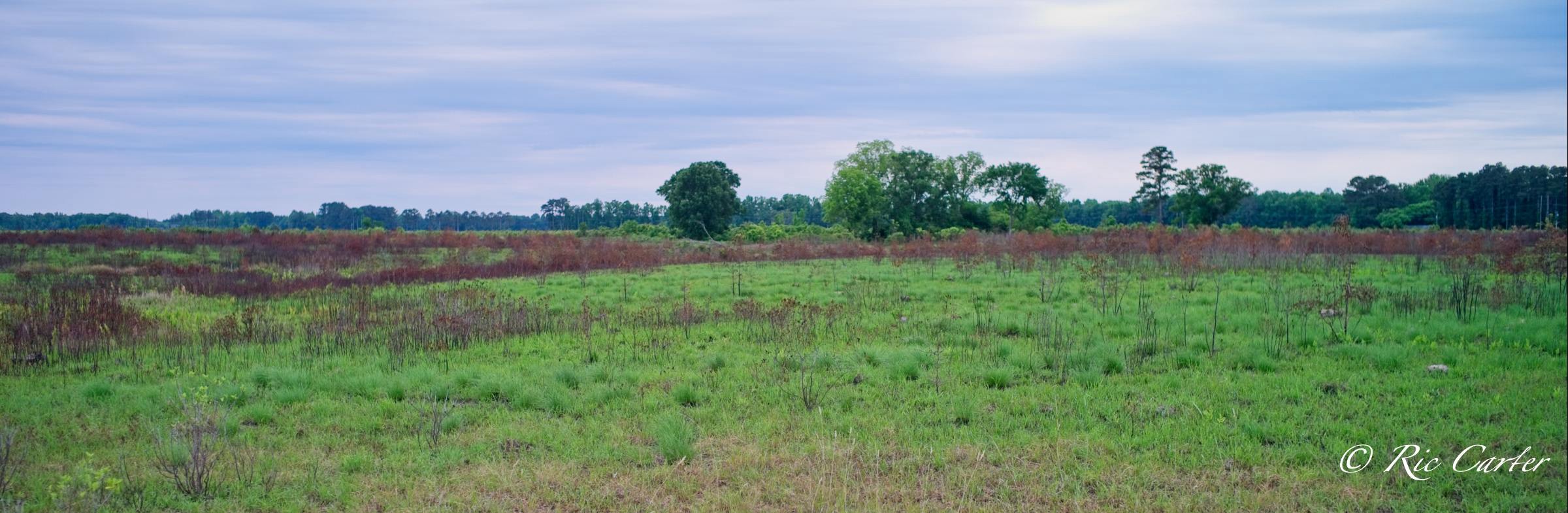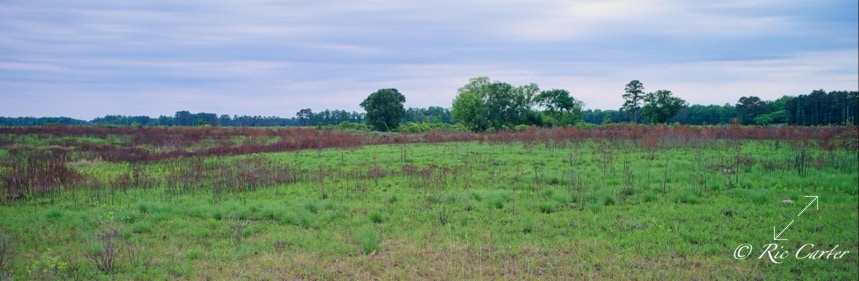 VOA Gameland’s does regular control burns to maintain the Carolina Plain habitat. Few examples remain. The one normal view here was taken about a week after the aerial. Humans see a ragged grassland with little animal life. BUT, after the burn, One can easily see the massive network of animal paths through the brush. You can see the places they meet, which paths are major routes and which are more obscure.