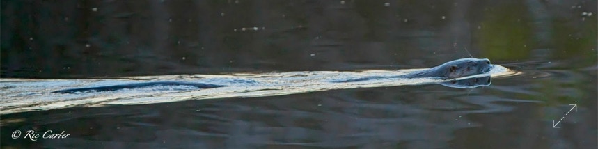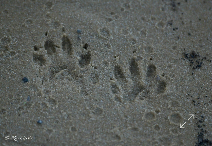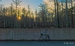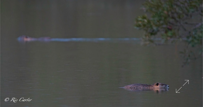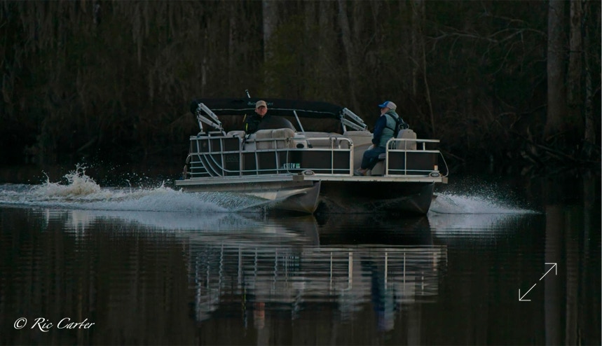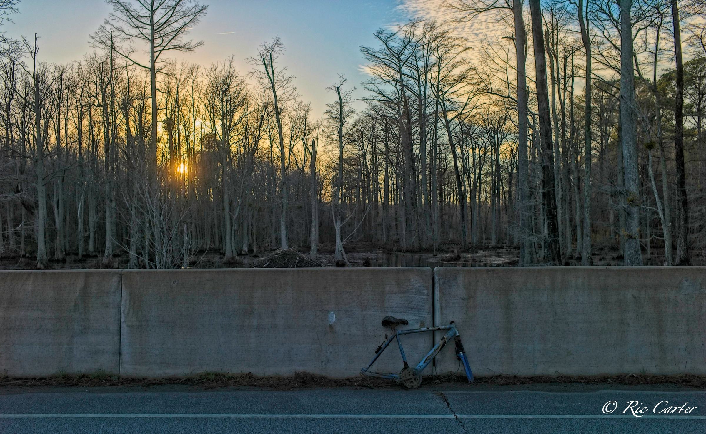 So, what do we have in this week’s grab-bag? I temporarily satisfy my never ending hunger to catch an airplane crossing the moon, a shore line after the recent cold-shock fish kills, a bike frame left on a bridge, a nutria, an otter, footprints in the sand at Goose Creek, Fred and Suzanna on the pier, a couple of passing aircraft, a passing boat, and a plant that refuses to to be intimidated by blinds.