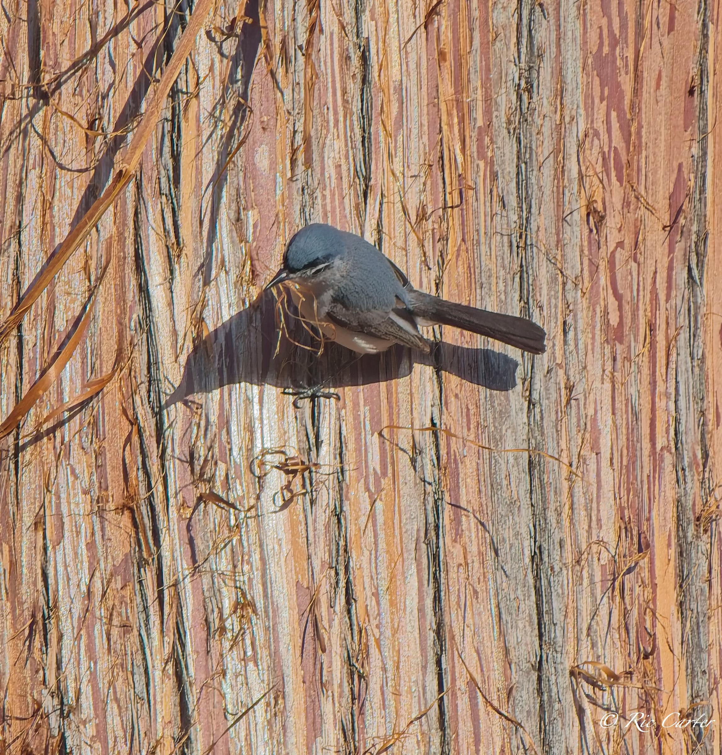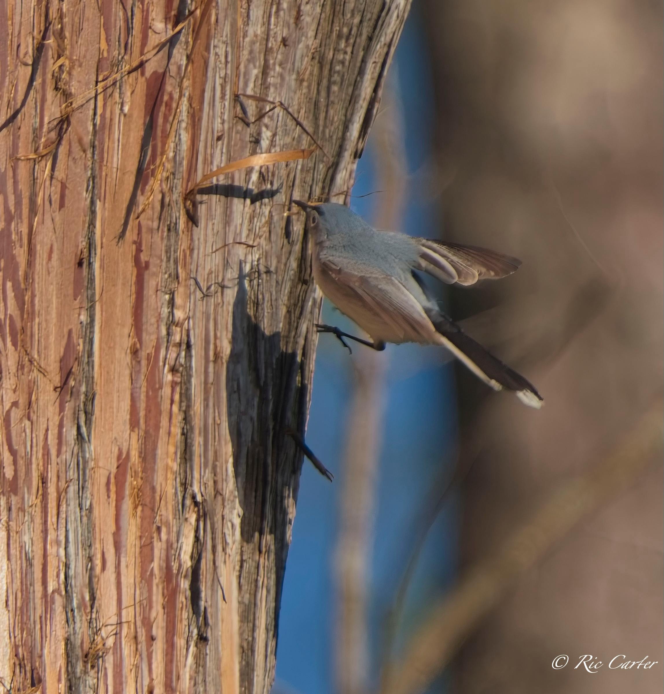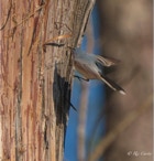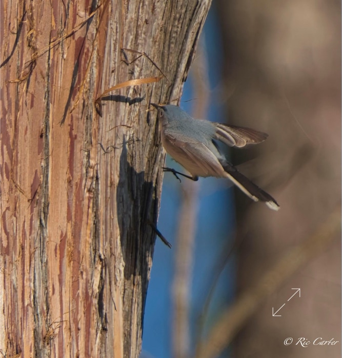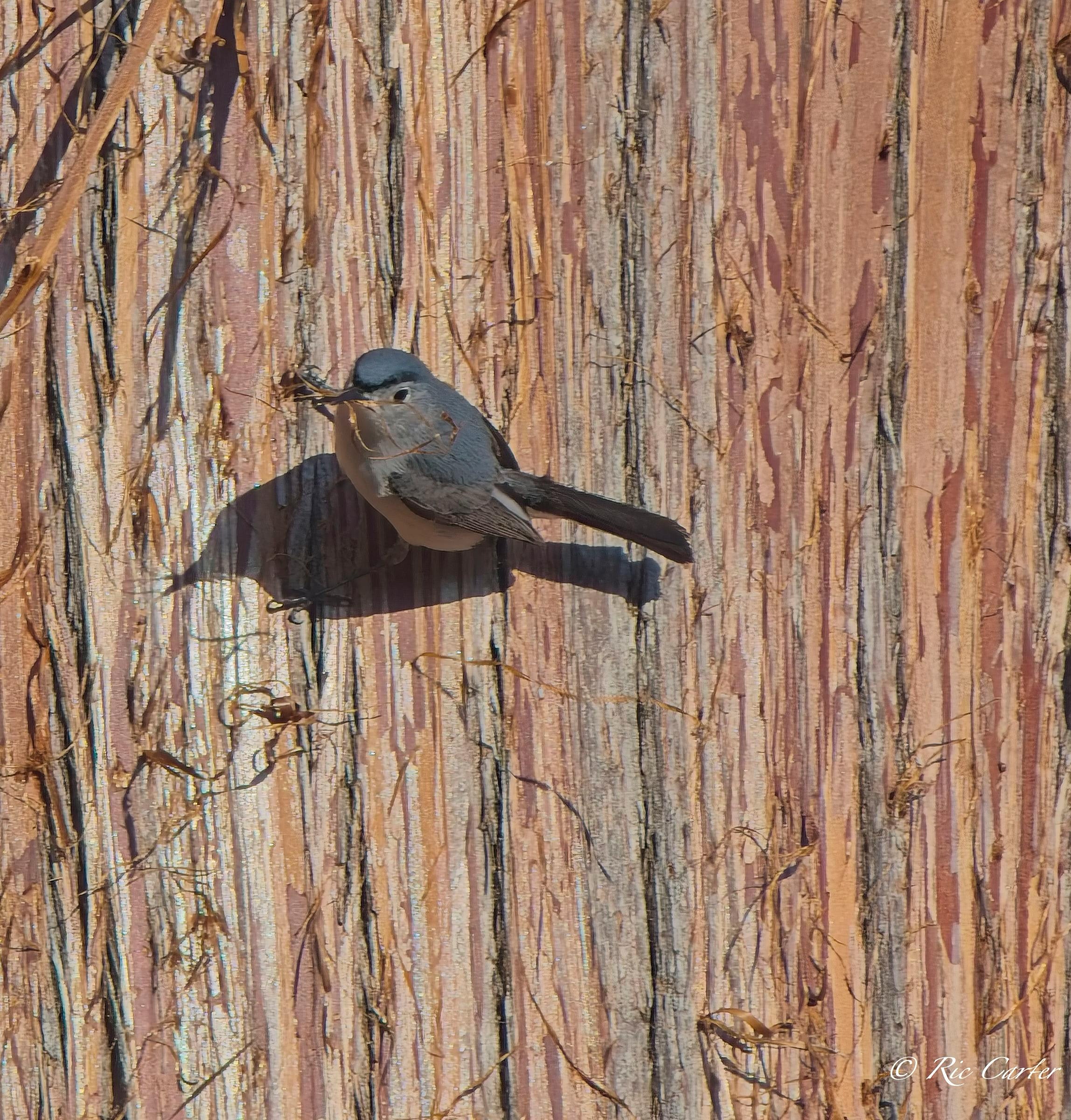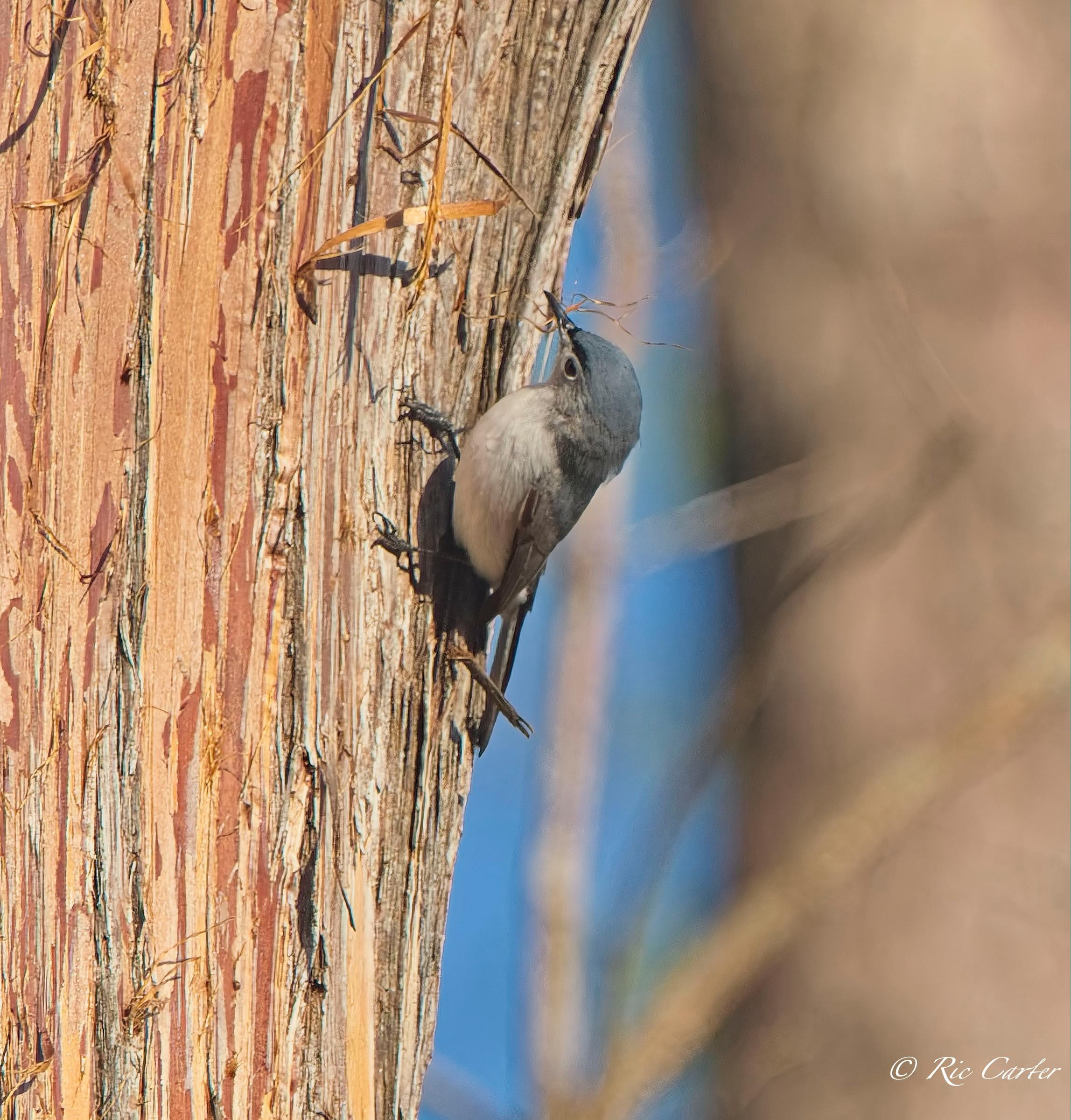 I had a lovely time one afternoon last week on the pier at the house. Looking at a nearby tree, I noticed a Blue Gray Gnatcatcher working around on the trunk. I thought at first it was bugging for lunch. After watching for a little, I realized that it was peeling bits of the stringy bark of the Cyress. Nest building season is hectic!