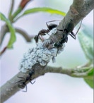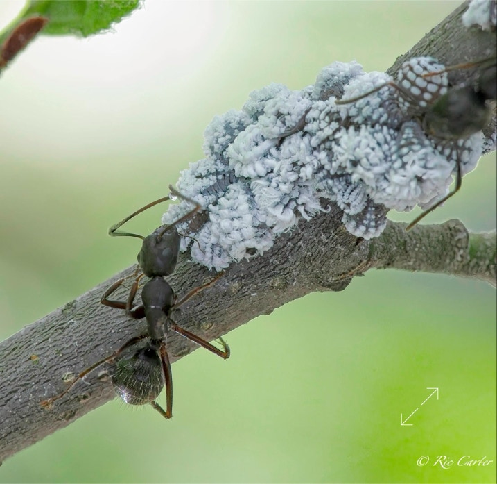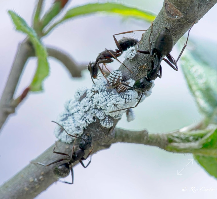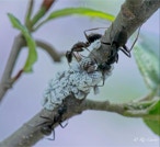 Every year we have these ants run an Aphid ranch on the branches of this Alder in our front yard. The ants tend the aphids and gather the honeydew they exude for feeding their colony.