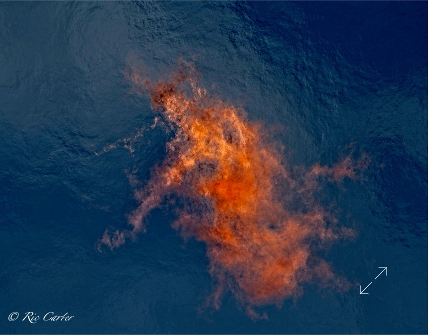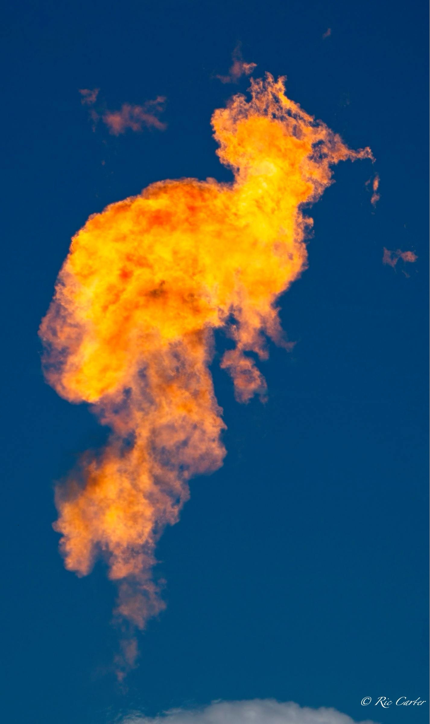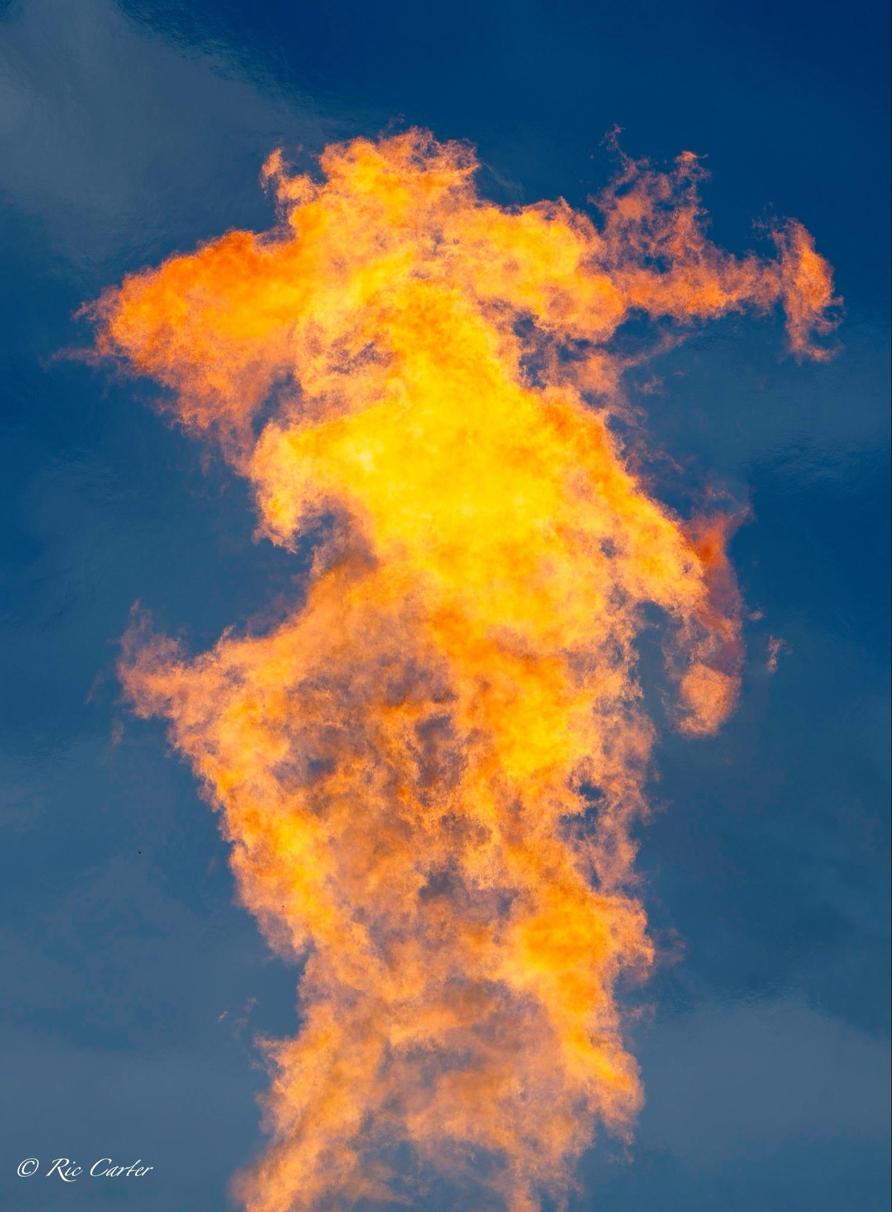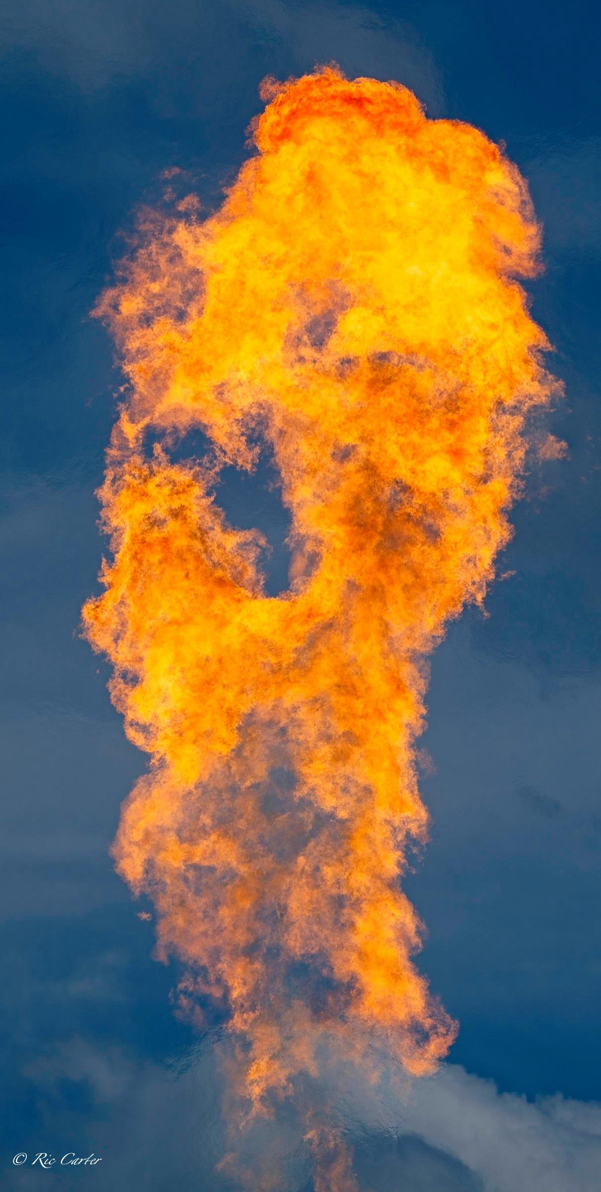 The gas company’s recent burn off of a pipeline set up a huge Bunsen burner that sounded like a jet as it flamed away. When frozen in place by a fast shutter, the flames furnish the same fodder for imagined pictures as star formations and clouds. What do you see?