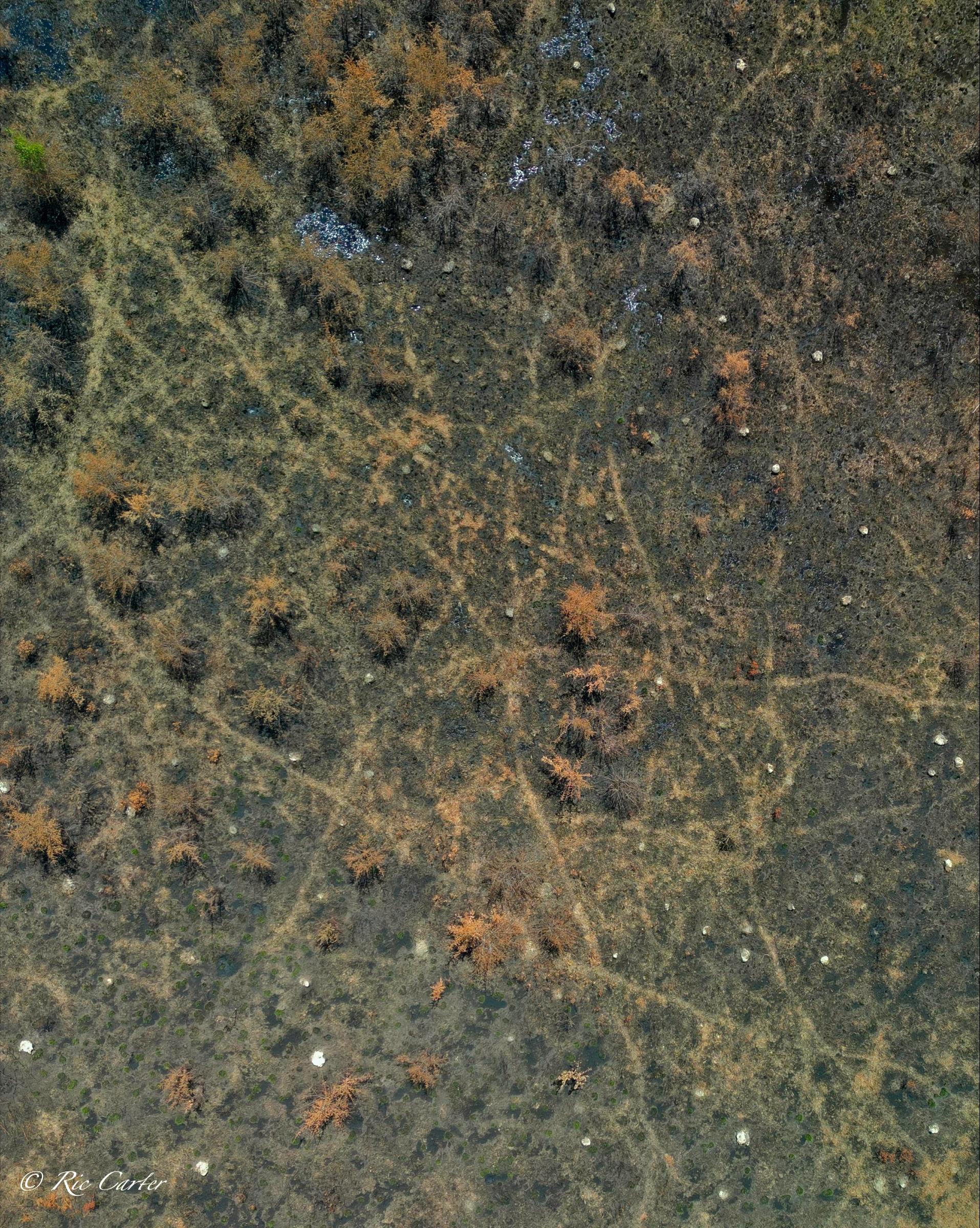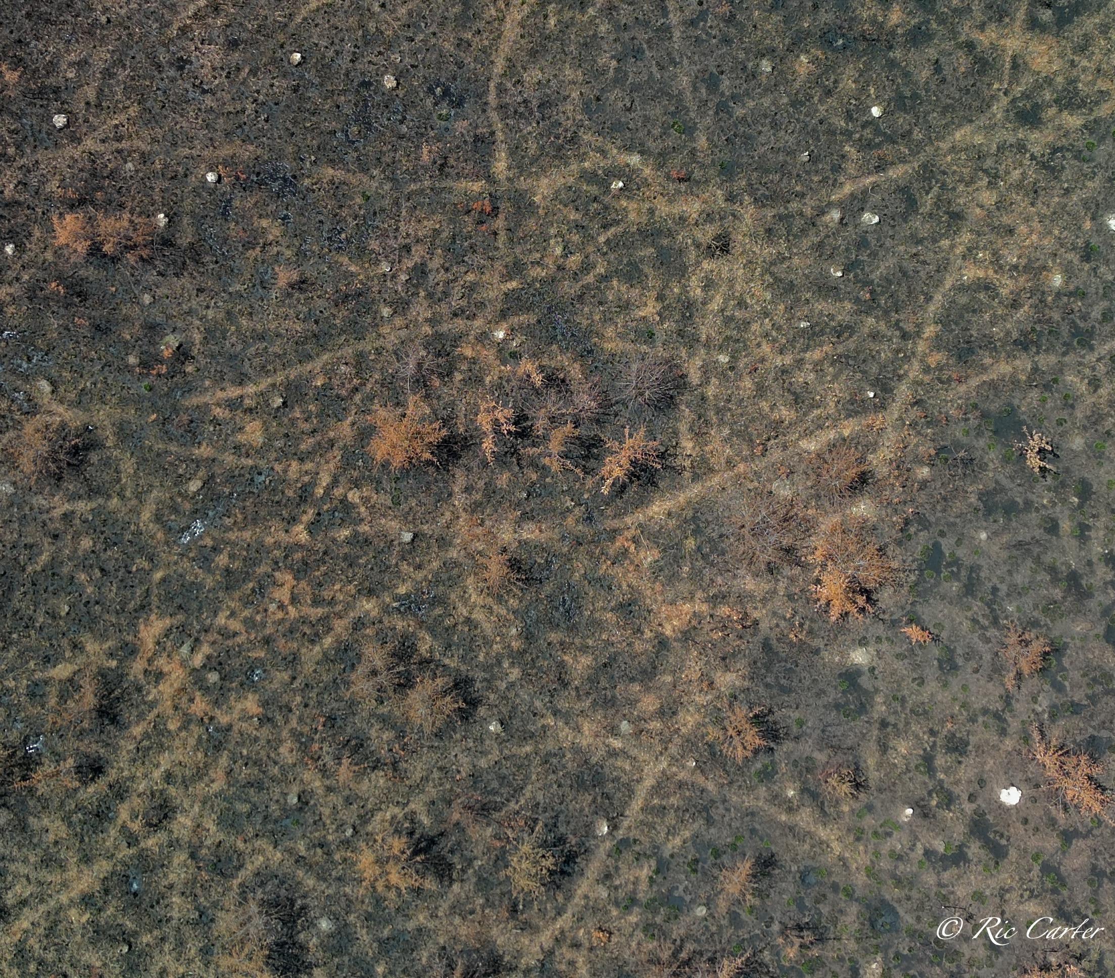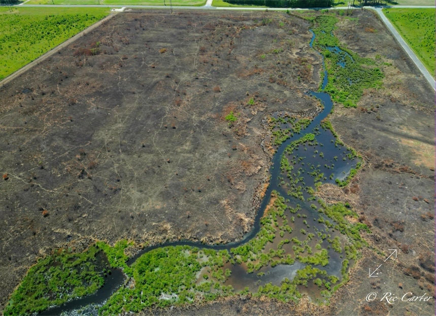 VOA Gameland’s does regular control burns to maintain the Carolina Plain habitat. Few examples remain. The one normal view here was taken about a week after the aerial. Humans see a ragged grassland with little animal life. BUT, after the burn, One can easily see the massive network of animal paths through the brush. You can see the places they meet, which paths are major routes and which are more obscure.