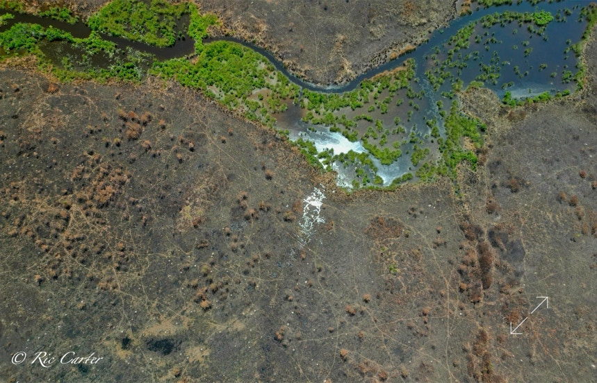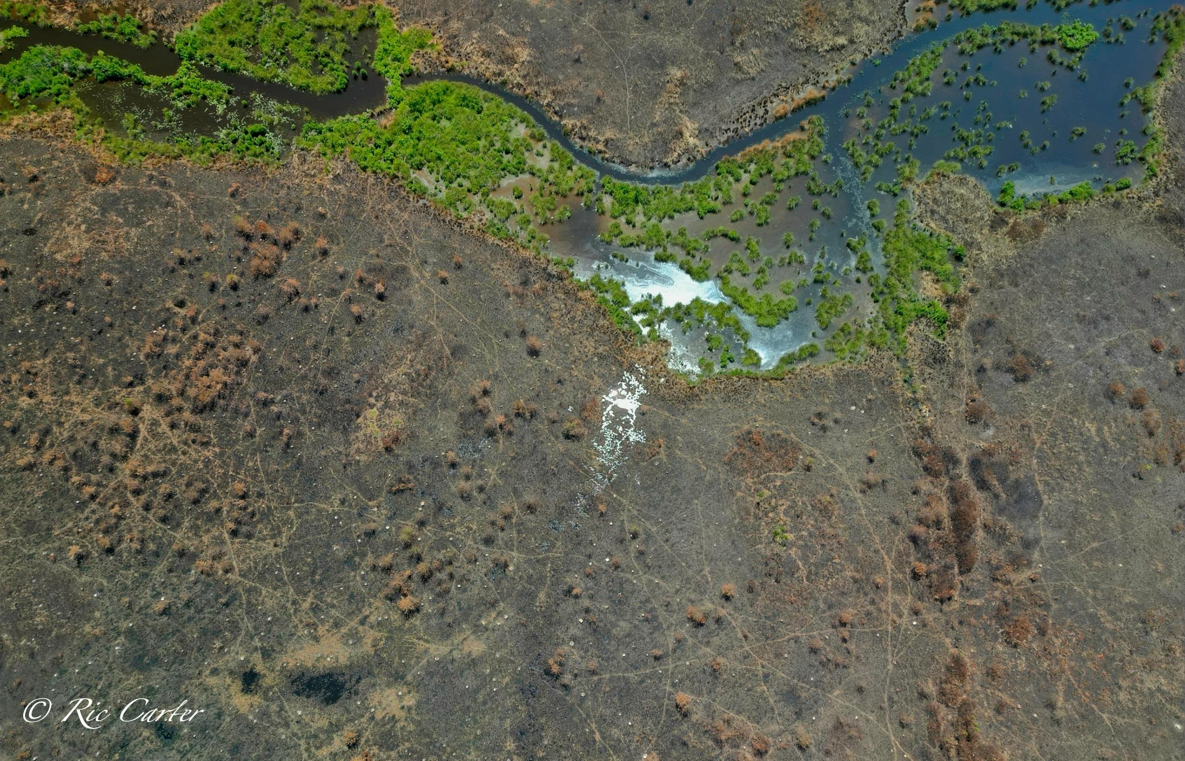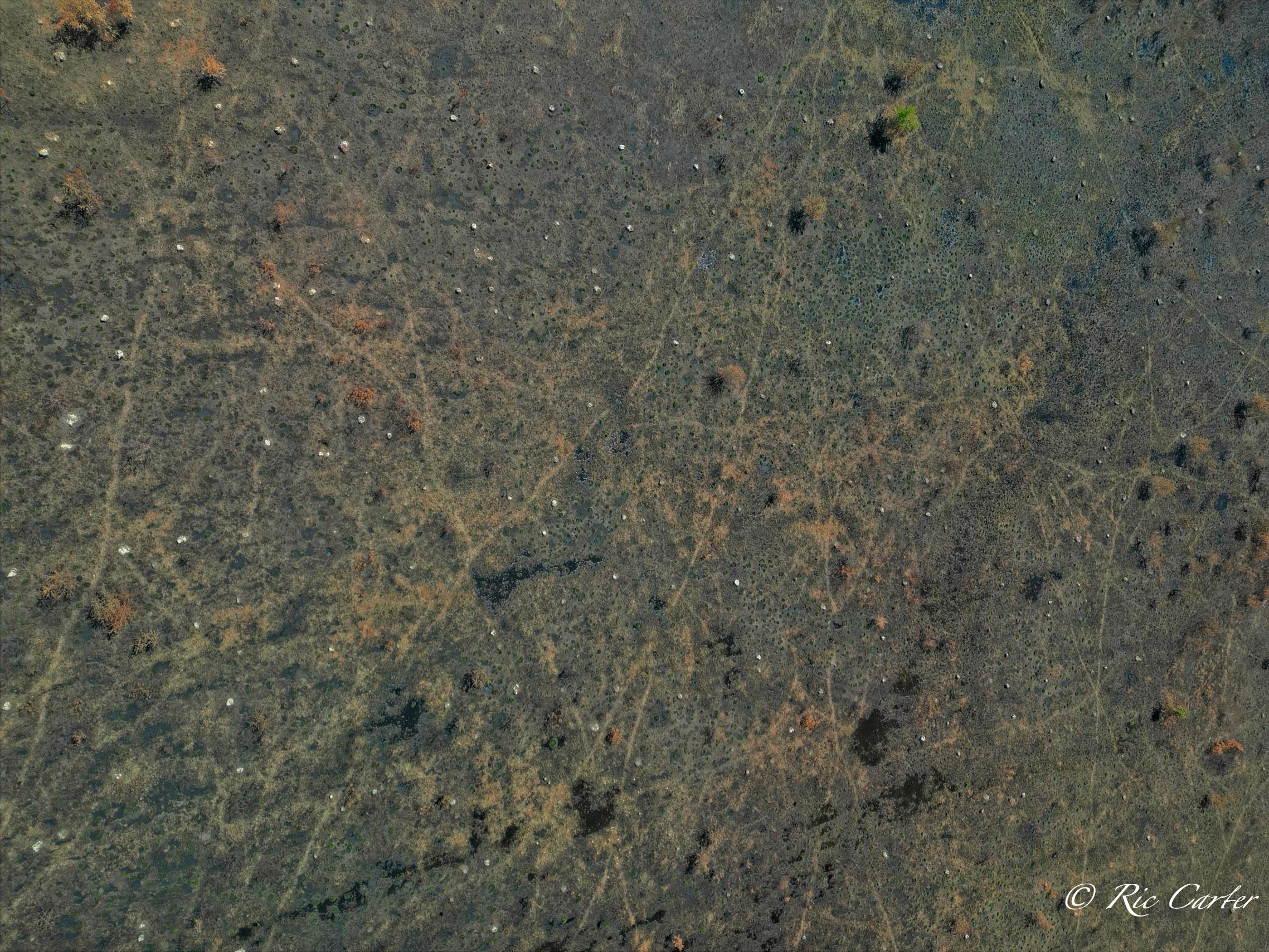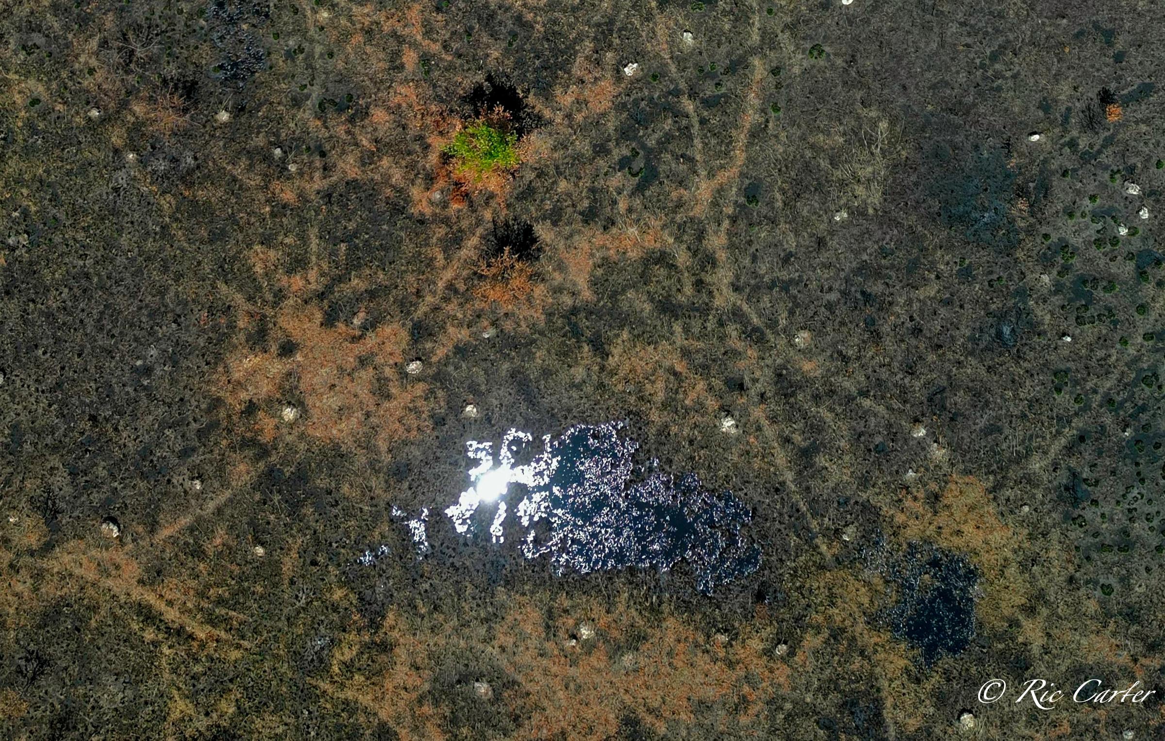 VOA Gameland’s does regular control burns to maintain the Carolina Plain habitat. Few examples remain. The one normal view here was taken about a week after the aerial. Humans see a ragged grassland with little animal life. BUT, after the burn, One can easily see the massive network of animal paths through the brush. You can see the places they meet, which paths are major routes and which are more obscure.